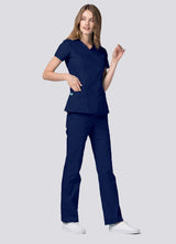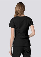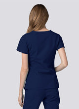 Double stitched mock wrap scrub top with princess seams in both the front and back for a flattering silhouette.